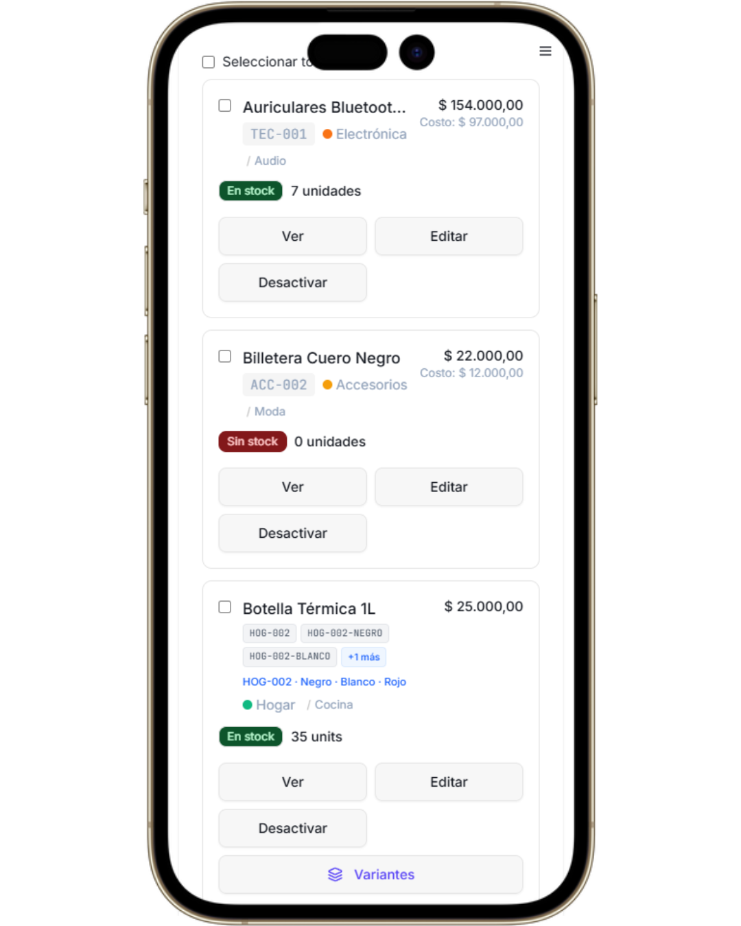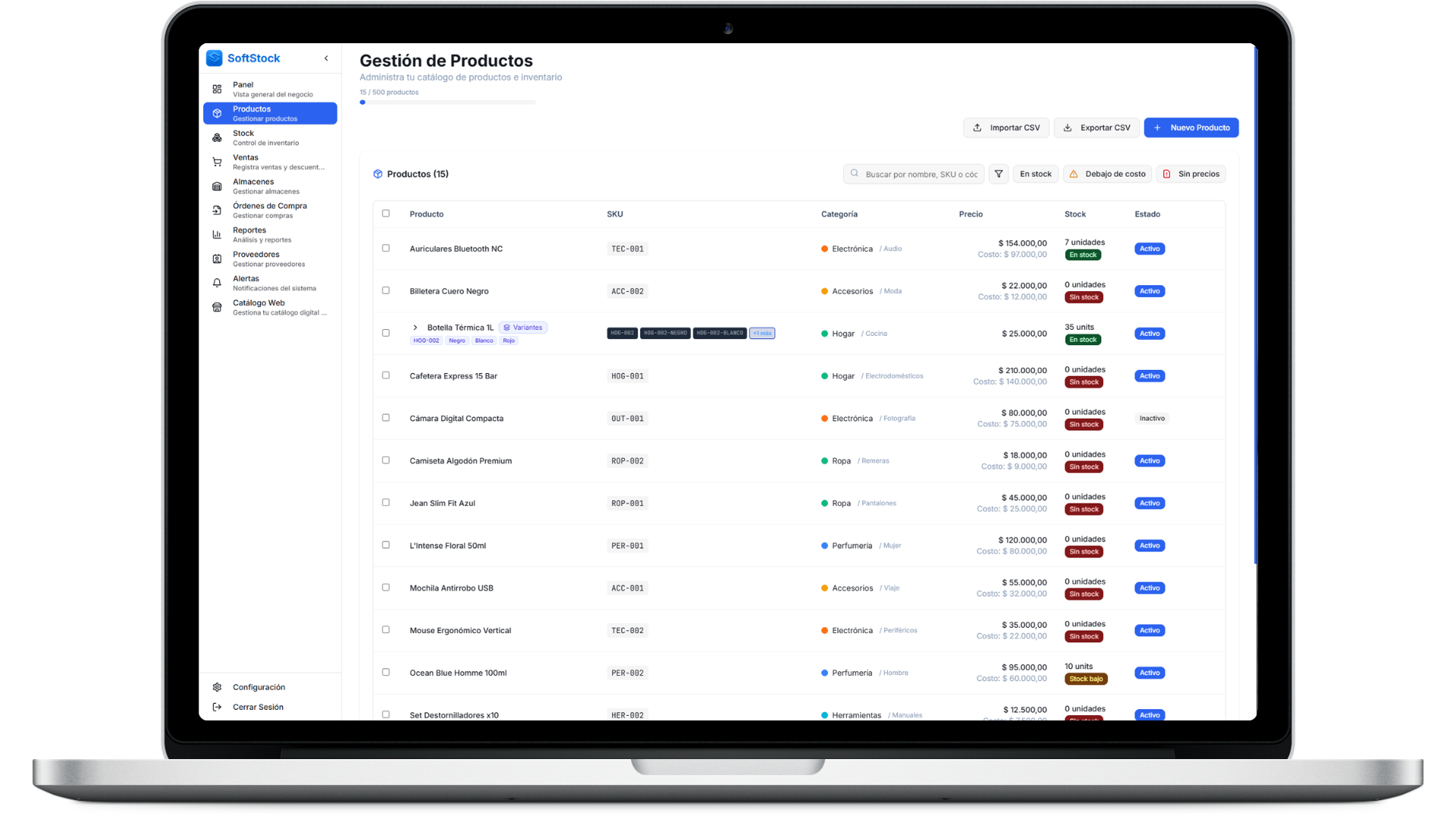Todos tus productos organizados con SKU, variantes, categorías y alertas de stock bajo. Importá y exportá con CSV en un clic.